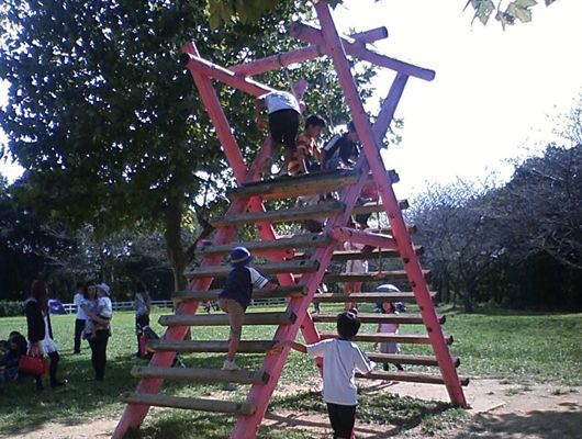 子供達に人気があったのは、竹馬、シーソー、大きなタイヤブランコです。