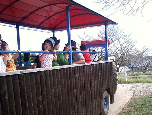 大きなトラクターがウエスタン調のワゴンを引いて牧場内のトロッコ列車の線路の回りを回ってきます。一周約10分位でしょうか。